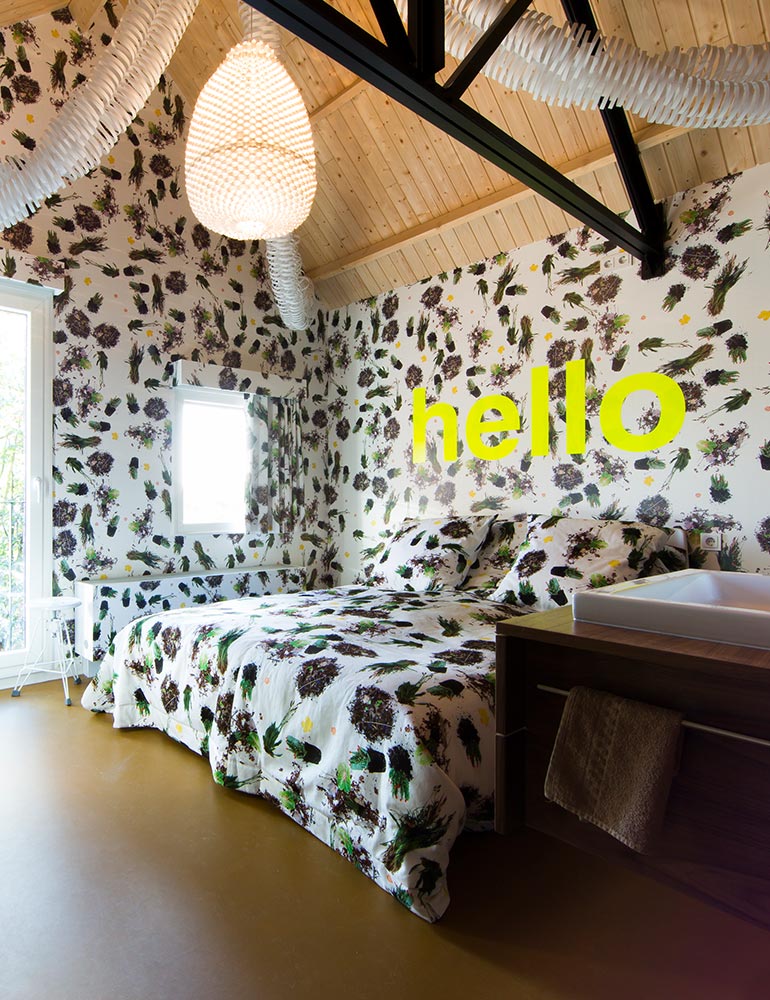 Room 32 Monique van Heist <p>Monique van Heist designed a very colorful wallpaper design with real plants, which she photographed and used in the entire room. In addition, there is an impressive lamp designed by Paula Arntzen. It spreads its tentacles to the four corners of the room.</p> <p>The Loft Room has a double bed of 1.60 by 2.00 meters. An extra single bed can be placed for &euro; 37.50 per night.</p> <p>Click on the button &#39;Book a Loft Room&#39; for the availability of one of our loft rooms. If you would like to specifically book the room by Monique van Heist, please&nbsp;<a href="mailto:receptie@hotelmodez.nl">email</a> or <a href="http://tel:+31026440993">call</a> our reception.</p>