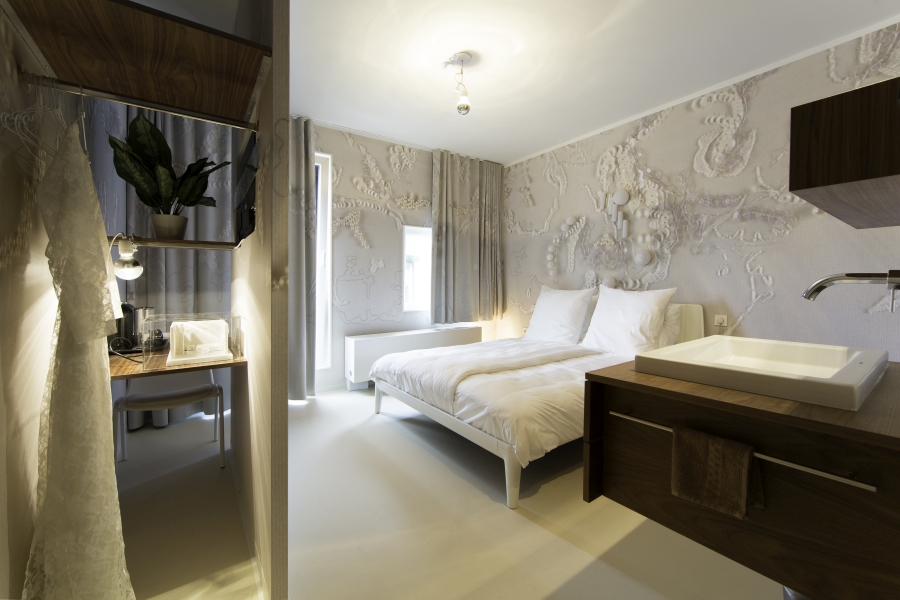 Kamer 27 Kant kamer door Petra Vonk, Coppens Alberts en Klaartje Martens <p>In deze kamer ondervindt u hoe verschillende kanttechnieken in diverse materialen worden gebruikt. Zo doen niet alleen het behang, de gordijnen en de vloer mee in het ontwerp, maar ook de speciale verlichting bekleed met kant geeft een bijzonder effect.</p> <p>In de Small Room staat een klein tweepersoonsbed van 1.40 bij 2.00 meter.</p> <p>Klik op de button &#39;boek een Small Room&#39; hiernaast om de beschikbaarheid van onze small rooms te bekijken. Wilt u specifiek de kamer van Petra Vonk, Coppens Alberts en Klaartje Martens reserveren, <a href="mailto:receptie@hotelmodez.nl">mail</a> of <a href="tel:+31026440993">bel</a><a href="http://tel:+31026440993"> </a> onze receptie.</p>