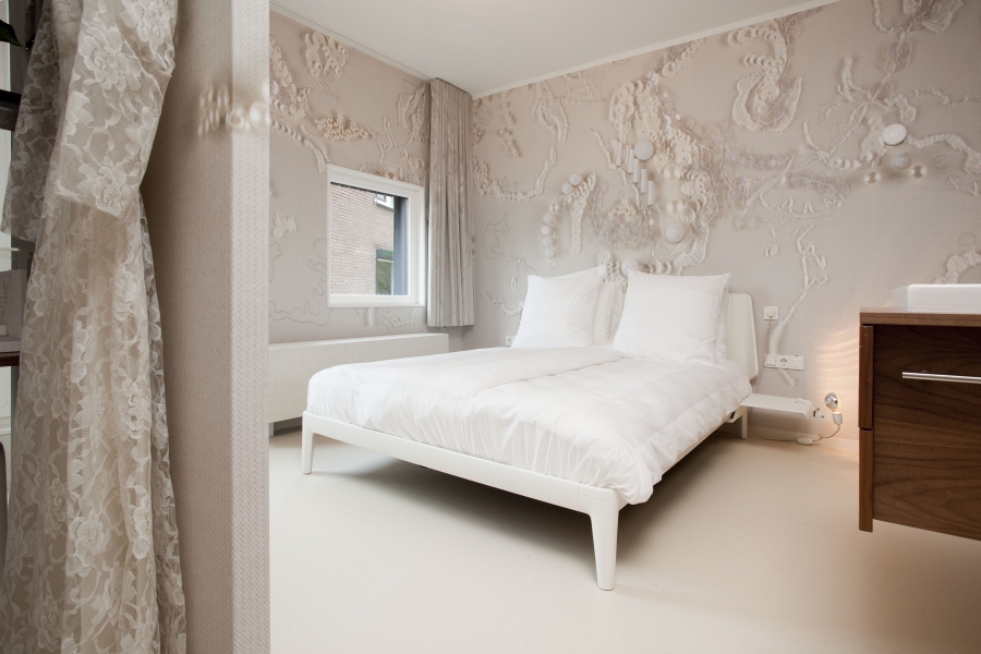 Kamer 8 Borduren door Martine van 't Hul <p>Deze kamer is ge&iuml;nspireerd op bruidsapplicaties. Nieuwe vormen van bruidsborduur zijn verwerkt in een op maat gemaakte maquette van de hotelkamer. Deze maquette is letterlijk uitvergroot in de kamer en is terug te vinden in&nbsp;zowel het behang als de gordijnen. In samenwerking met het Nationaal Glas Museum te Leerdam zijn glazen kralen geblazen. Deze zijn geborduurd op de achterwand van het bed.</p> <p>In de Comfort Room staat een tweepersoonsbed van 1.60 bij 2.00 meter.</p> <p>Klik hiernaast op &#39;boek een comfort room&#39; om de beschikbaarheid van onze Comfort Rooms te zien. Wilt u specifiek de kamer van Marine van &#39;t Hul reserveren, <a href="mailto:receptie@hotelmodez.nl">mail</a> of <a href="tel:+31026440993">bel</a><a href="http://tel:+31026440993"> </a> onze receptie.</p>